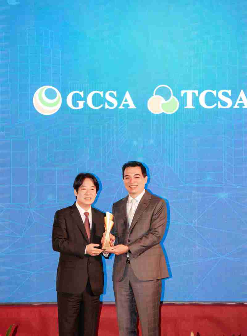 达全方位永续表现获全球永续奖及台湾永续奖肯定,,由副总统赖清德颁奖 (左),,,,2121非凡总经理柯富仁 (右) 代表领奖