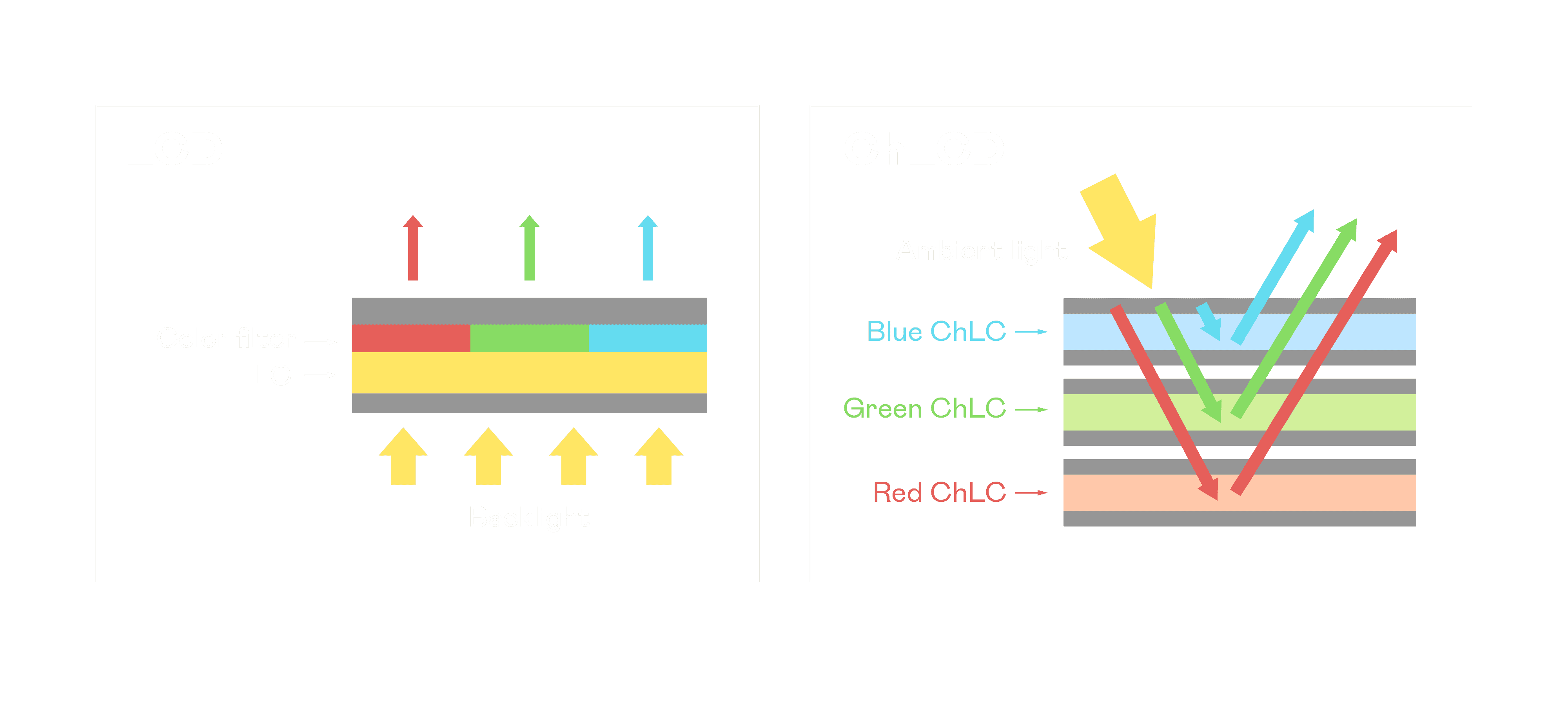 ChLCD 胆固醇液晶就如同纸张一样,,透过反射环境光来显示影像,,因此长时间观看不易造成人眼视觉疲劳,,,,可达到护眼效果。。。当处于户外阳光下使用,,,,LCD 影像容易失真而不易观看,,,,但胆固醇液晶仍可维持较佳的影像品质。。。